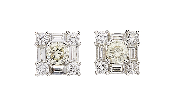 Each centrally set with a round brilliant cut diamond of yellow hue, surrounded by alternating white baguette and round brilliant cut diamonds, mounted in 18ct white gold.