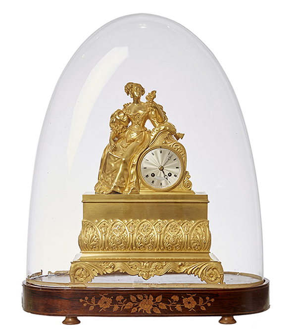 The silvered engine turned dial surmounted by a seated figure of a lady holding a bouquet of flowers, set upon a platform base band of raised arched and scroll motifs, the movement marked PC 555, the clock 40cm high, with dome 60cm high.