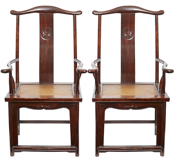 featuring a finely carved peony to the back of each chair, and wicker seats. Probably Huanghuali.