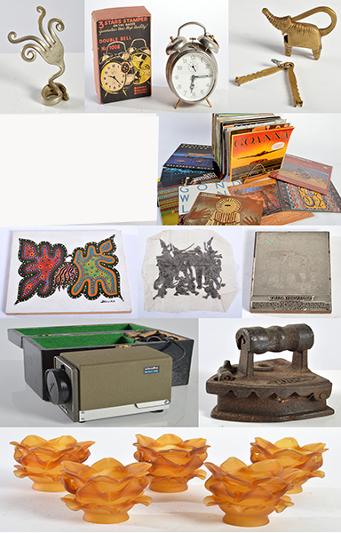 A BOX OF ASSORTED ITEMS, INCL. RECORDS, CLOCK, TIN BOXES, ETC.