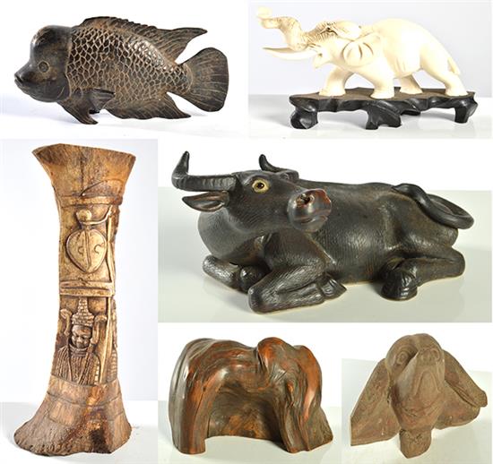 A QUANTITY OF WOOD AND ORGANIC ITEMS, INCL. A RELIEF CARVED BONE, BUFFALO HORN, ETC.