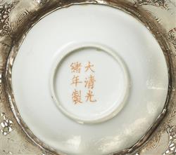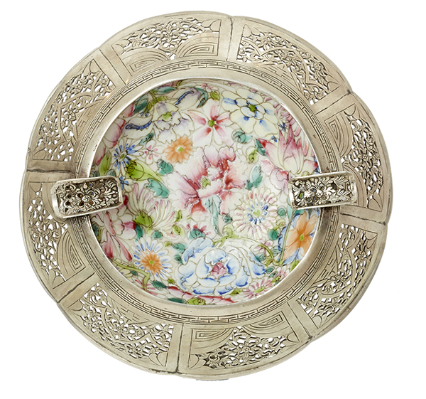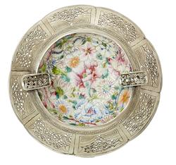 With pierced silver rim supporting the central porcelain 'Mille Fleur' dish. 13cm diameter.