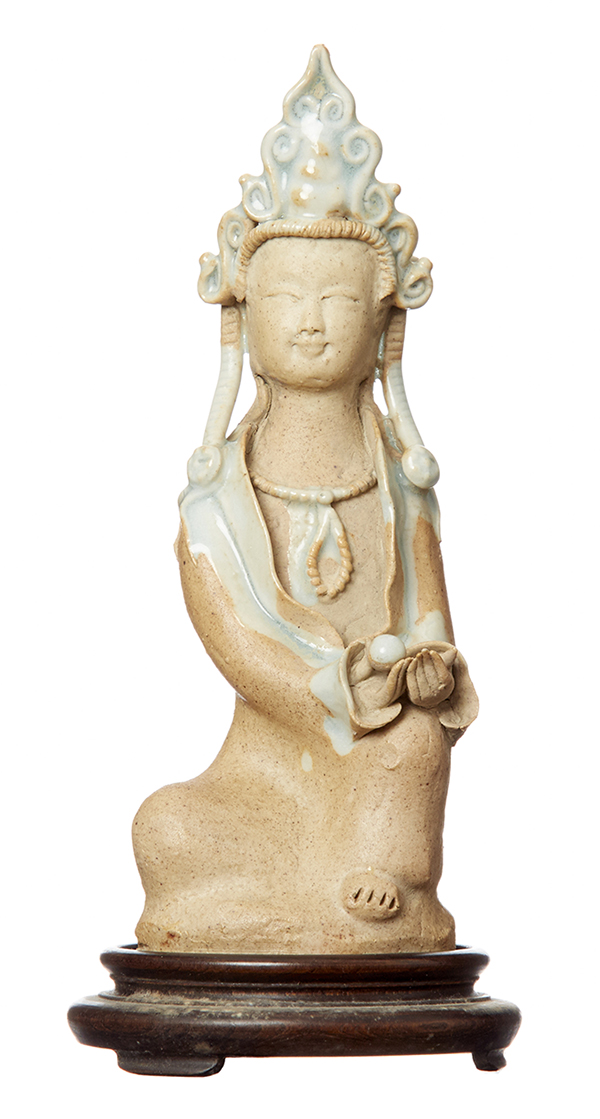 Positioned on a wooden stand in seated pose, holding a lotus in both hands. 15.5cm high.