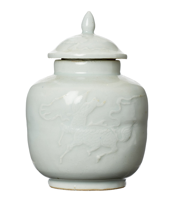 Celadon glazed with 'lucky animal' decoration. 12.5cm high.