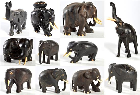 A COLLECTION OF WOODEN AND EBONY ELEPHANTS WITH IVORY AND BONE DETAIL