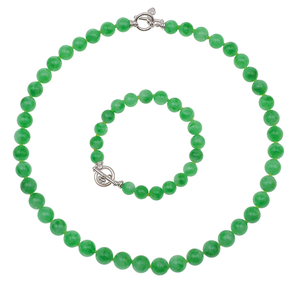 The round polished jadeite beads measuring 7.50mm - 9.30mm, finished with an 18ct white gold and diamond set clasp, total length 430mm and 180mm.