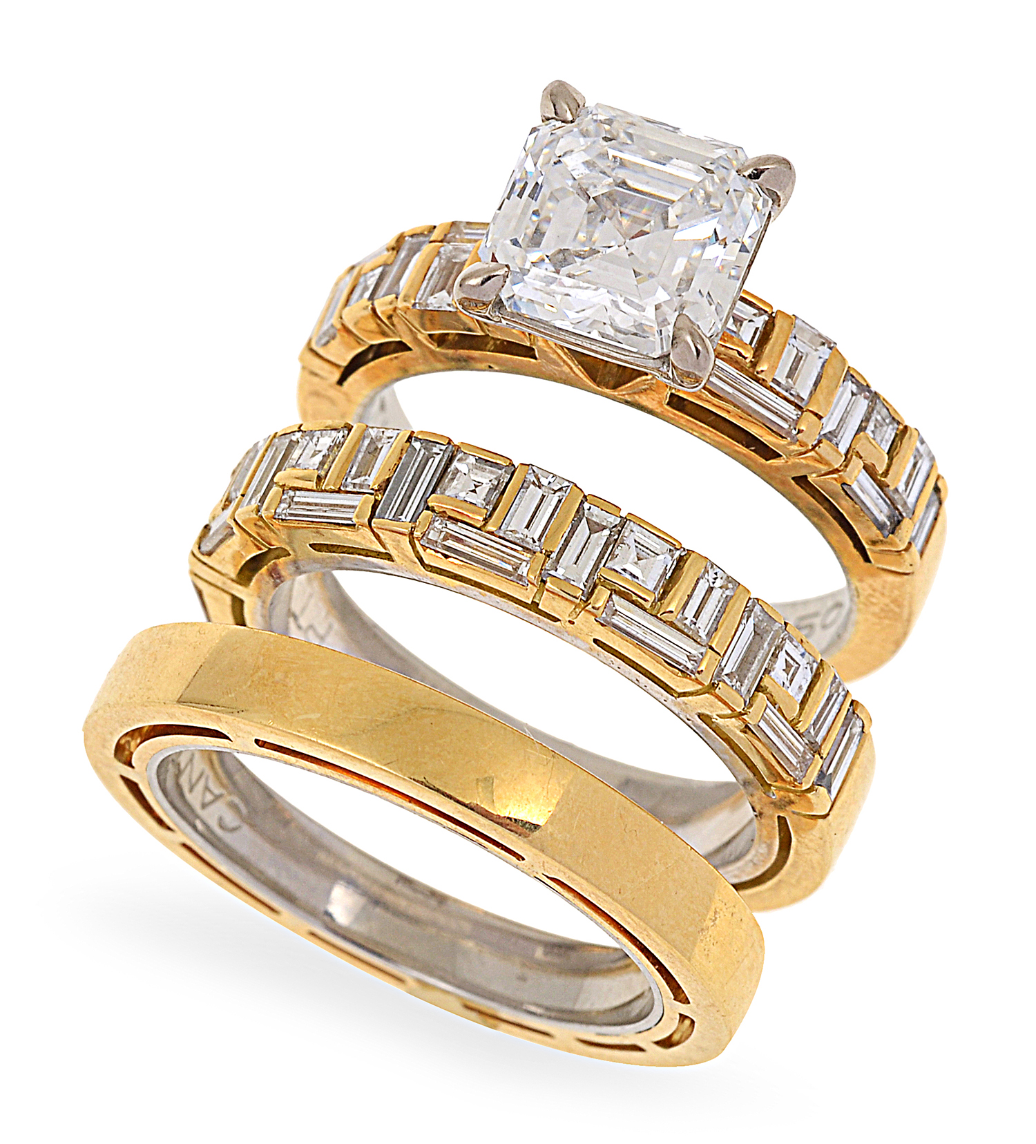 From the Cubism collection, the square emerald cut diamond of 2.11cts, accompanied by a GIA certificate 12107229 stating colour E, clarity Internally Flawless, having baguette and carre cut diamonds set to the shoulders, together with a matching diamond set band and a plain band, all mounted in 18ct gold, ring size J, boxed.