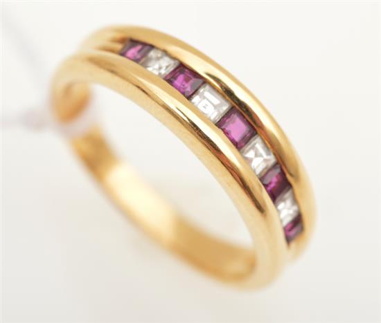 A CARRE CUT RUBY AND DIAMOND RING IN 18CT GOLD