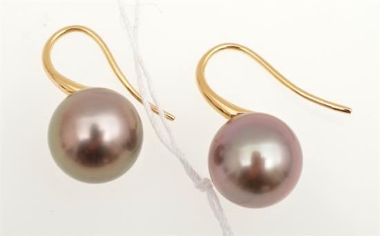 A PAIR OF TAHITIAN PEARL EARRINGS OF 11.5MM TO SHEPHERD HOOK FITTINGS IN 9CT GOLD