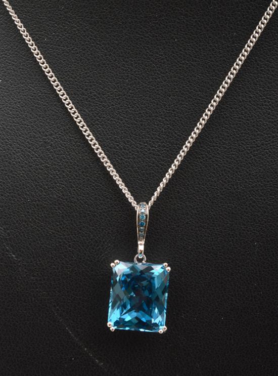 A TOPAZ AND BLUE DIAMOND PENDANT IN 14CT WHITE GOLD