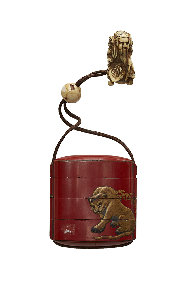 With tiger and bamboo in gold and silver, ivory netsuke and ojime, 8cm high.