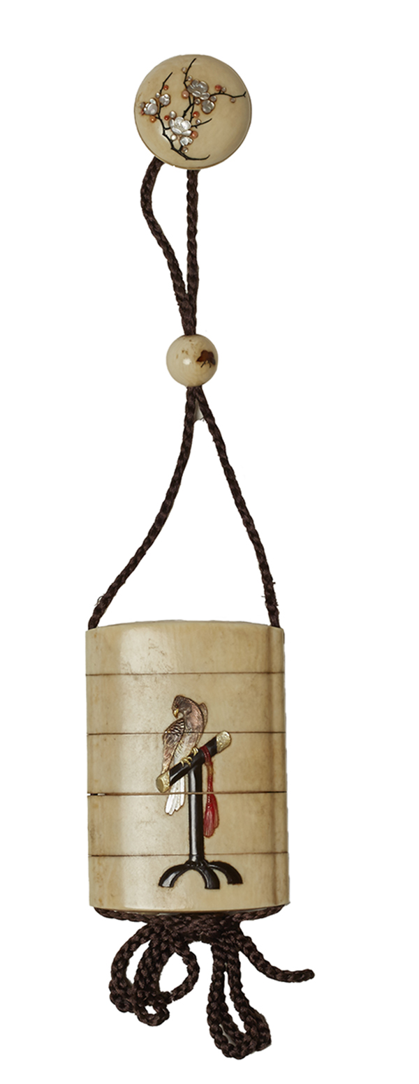 Inlaid with cockatiel and hawk design in mixed materials, ensuite ojime and manju netsuke also signed on a mother of pearl plaque, 8.2 x 5.7cm.