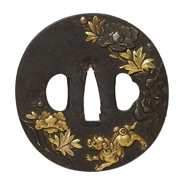 Featuring prancing Shishi in Gold Taka-zogan relief amongst silver and gold flower motifs 8 x 8.5 x 0.5cm.