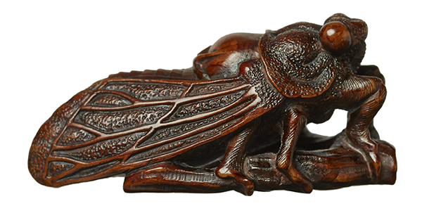 The form of a cicada on branch, a popular subject matter for this artist, signed Harumitsu, 5.5 cm high.