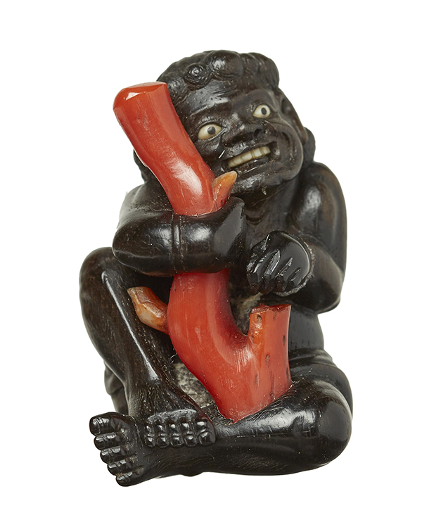 Featuring a well carved South Sea Islander holding a coral branch, inlaid ivory eyes and teeth with repair to hand, signed Masamitsu. 5cm high.
