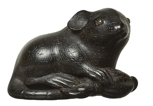 The form of a mouse with inlaid eyes holding a nut, unsigned, 4cm high.