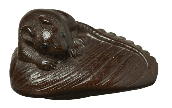 Featuring a rat with inlaid ebony eyes atop a shell, 4.8cm high.