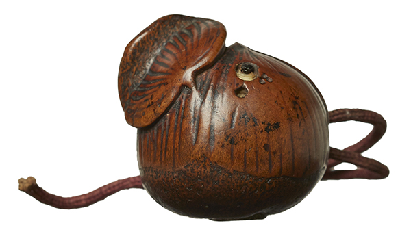 Depicting a worm inside a chestnut carved with ivory and ebony inlay, 4cm high.