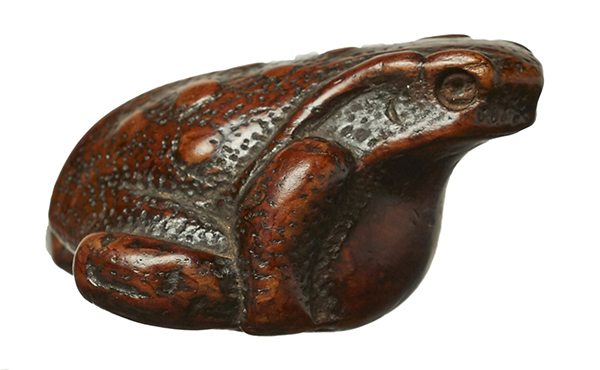A LATE 18TH EARLY 19TH CENTURY JAPANESE WOODEN NETSUKE OF A SEATED TOAD, EDO PERIOD