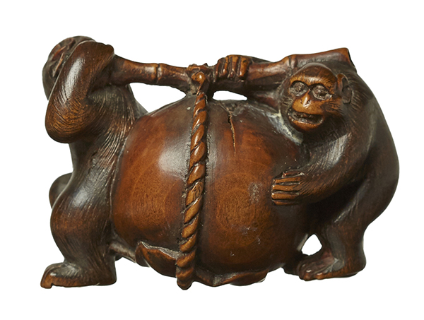 A LATE 18TH EARLY 19TH CENTURY JAPANESE WOOD NETSUKE, OF MONKEYS CARRYING A PERSIMMON