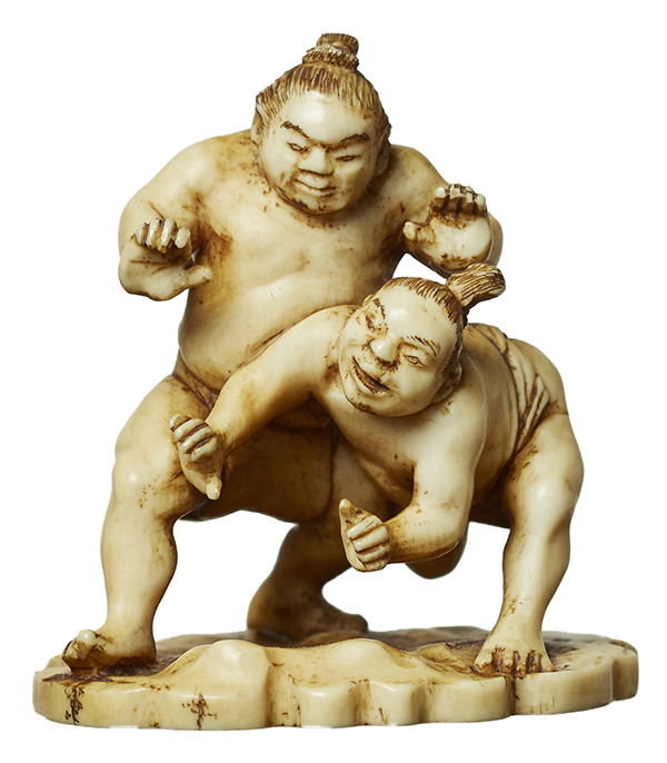 A 19TH CENTURY JAPANESE IVORY NETSUKE OF SUMO WRESTLERS, MEIJI PERIOD