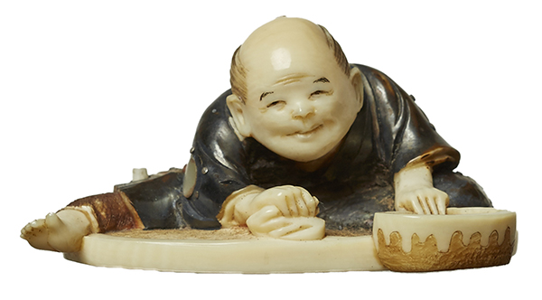 A 19TH CENTURY JAPANESE SHIBAYAMA IVORY AND LACQUER NETSUKE, MEIJI PERIOD