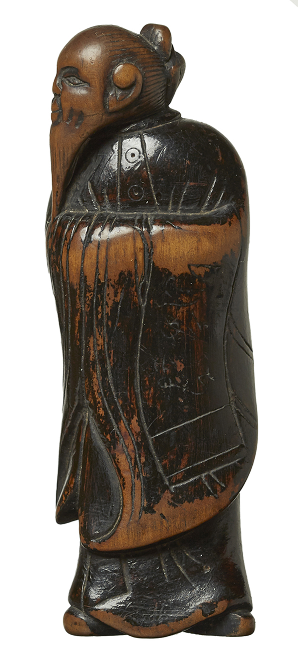A LATE 18TH EARLY 19TH CENTURY JAPANESE CARVED WOODEN NETSUKE OF A SAGE