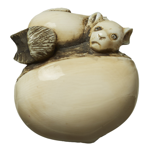 A 19TH CENTURY JAPANESE IVORY NETSUKE OF A SQUIRREL ON A CHESTNUT