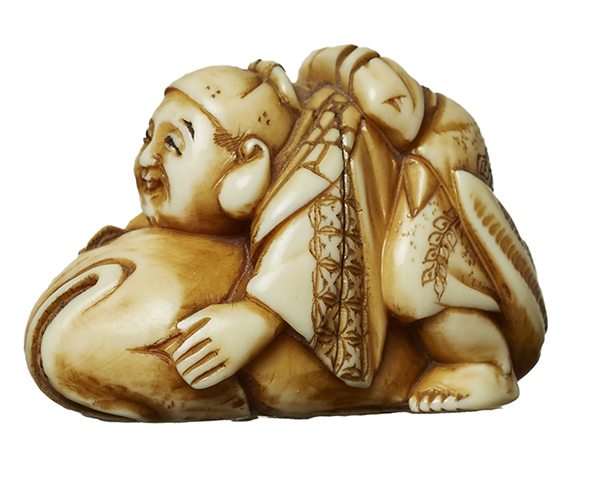 A JAPANESE IVORY NETSUKE, BOY RIDING A FISH, MEIJI PERIOD