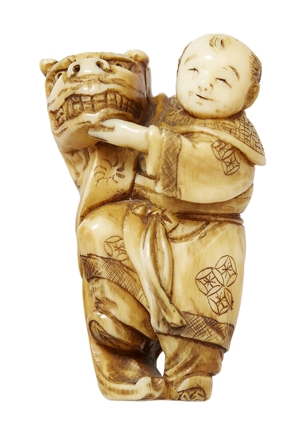 A 19TH CENTURY JAPANESE IVORY NETSUKE, YOUNG BOY AND SHISHI MAI, MEIJI PERIOD