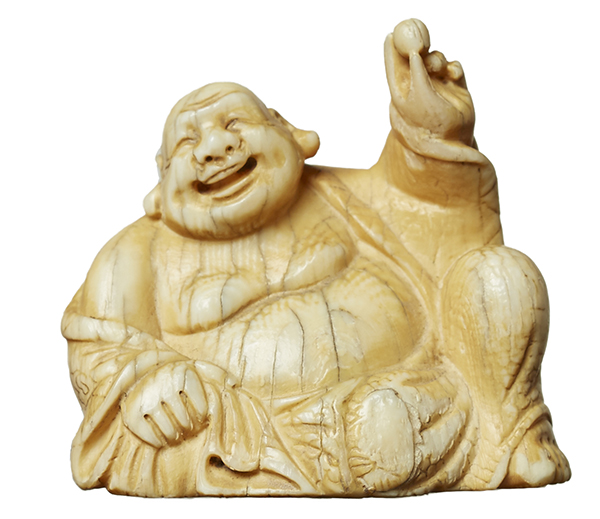A carved study of Hotei holding the pearl of Buddhist wisdom, 3.5cm high.