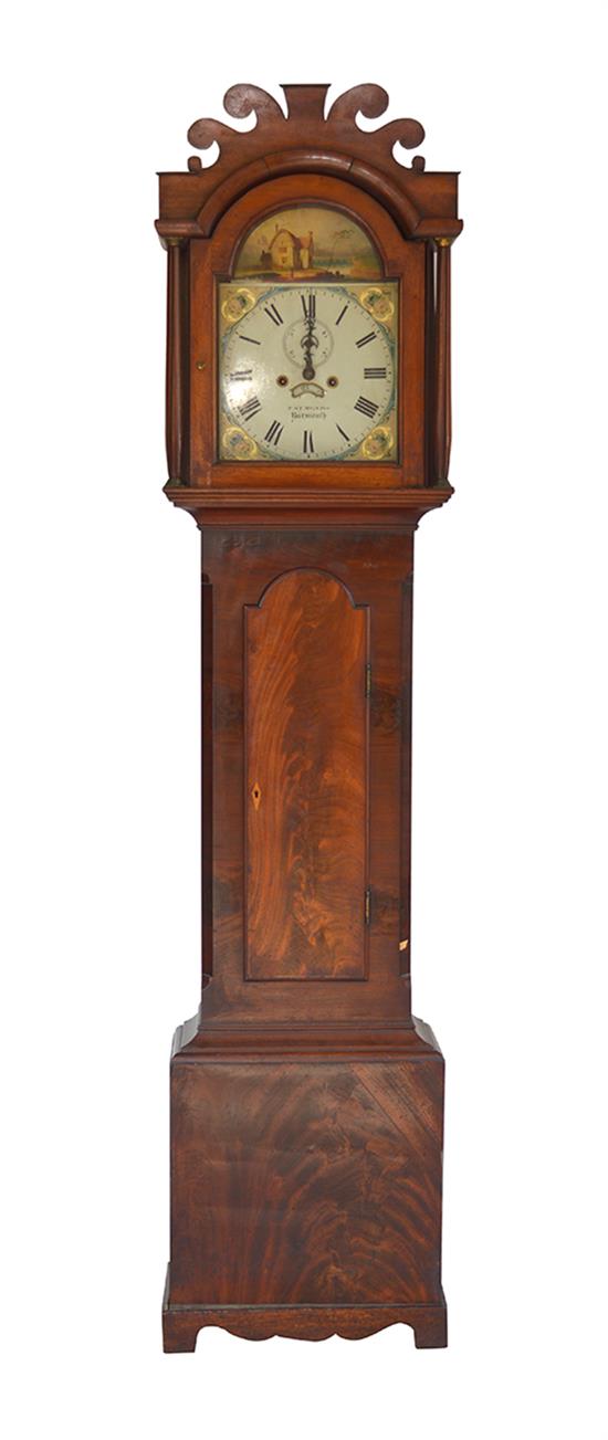 dial surmounted by hand painted cottage scene, accompanied by two weights, 199cm tall
