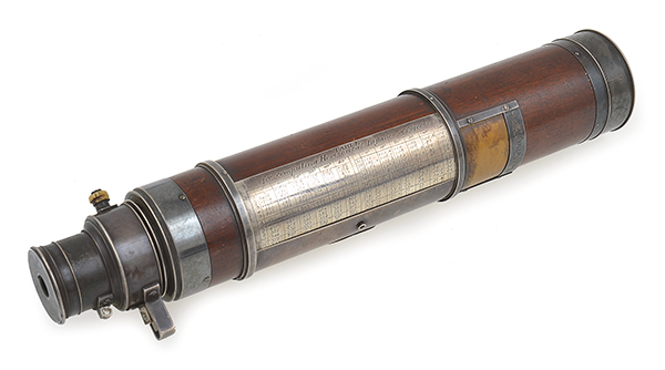the mahogany barrel is 109cm fully extended and relatively 33cm closed. Mounted on the barrel is a sliding silver plaque bearing a medallion pre-dating the 1801 coat of arms of George III and marked "The King's Royal Patent", the secondary plaque is revealed beneath the initial plaque inscribed "Table for computing Horizontal Distance of Objects". the scale of this table is in seconds with numbers at the side from 0 to 60. applied to the base of the barrel is a third plaque crafted from ivory framed in silver and inscribed M/Gen A. Farrington RA. General Sir Bart. Anthony Farrington accompanied the Duke of York to Holland in 1799, when General Farrington was Commandant of Woolwich Artillery, and the Duke was the commander in chief of the British Army. It is possible Farrington was given this instrument in recognition of his services.