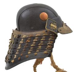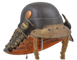 early Iron Kabuto with two inscribed signatures on the inner surface of the plates, signature by Myochin in his 77th year in relation to the addition of the mabizashi (visor) in 1598, with additional signature of Fujiwara Munemichi and date of 1663, and a five -lame Shikoro (Neck guard), each side of the helmet features a moon and sun decoration as well as a fukigaeshi (turnback) with a family mon symbol and a shot proof-mark on the helmet plates
