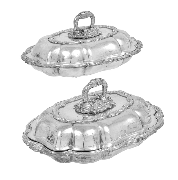 A PAIR OF 19TH CENTURY SHEFFIELD PLATE LIDDED TUREENS
