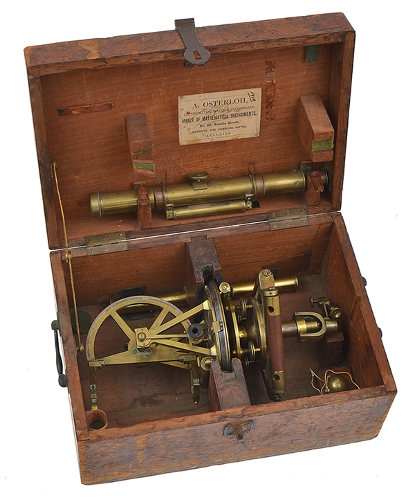 The trade label on the box reads "A. Osterloh, chronometer, watch and clock maker. Maker of Mathematical instruments. 60 Rundle street, opposite the Hamburg Hotel, Adelaide". 41 x 28 x 21cm
