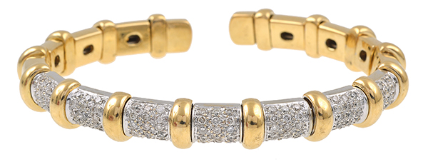 The flexible cuff centrally set with seven panels of pave set diamonds, mounted in 18ct gold.