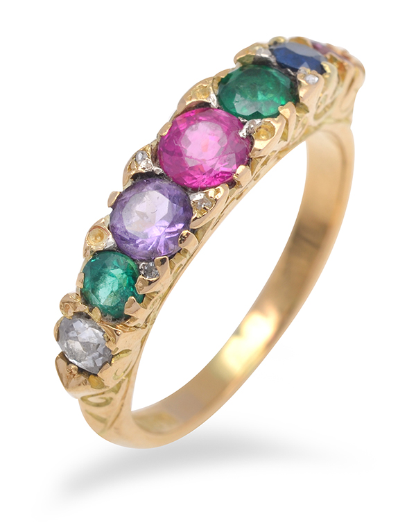 Set with the traditional stones of diamond, emerald, amethyst, ruby, emerald, sapphire and tourmaline with diamond detail in 18ct gold, ring size L.