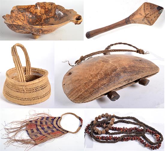 A SMALL COLLECTION OF TRIBAL ITEMS INCL BASKET, MODEL BOAT, CLUB, WOODEN BOWL ETC