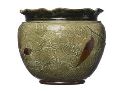 Of bulbous form with pinched everted rim, impressed with foliage design, impressed mashman mark, 16cm width x 19cm high. Possibly by maker Thomas Stevens, ex-Doulton Lambeth, London.