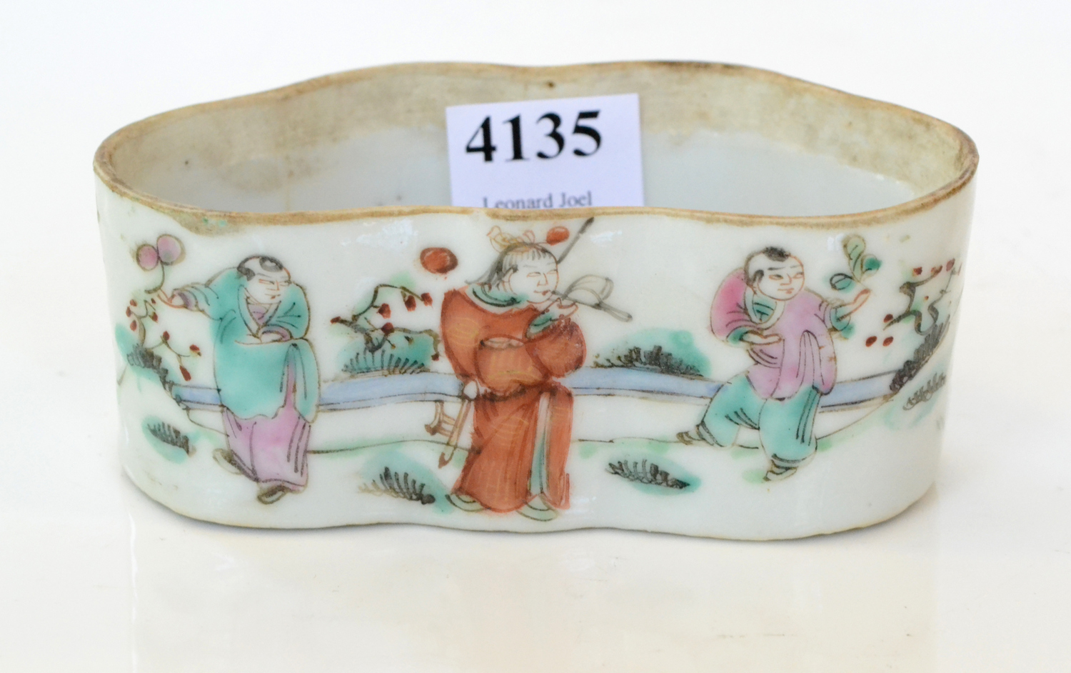 Of lobed form painted with procession of court figures within a landscape, 10cm long, wax seal to base.
