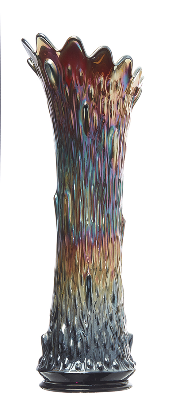 A RARE AMERICAN NORTHWOOD CARNIVAL GLASS 'FUNERAL' VASE IN AMETHYST WITH ELEPHANT FOOT