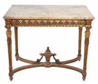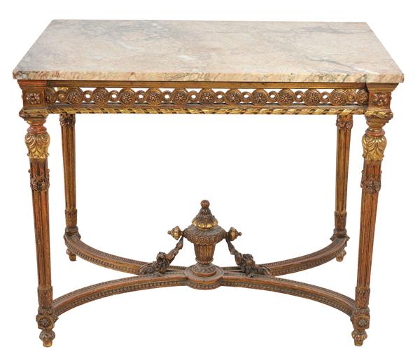 A LOUIS XVI STYLE GILT WOOD FRAMED MARBLE TOP SIDE TABLE