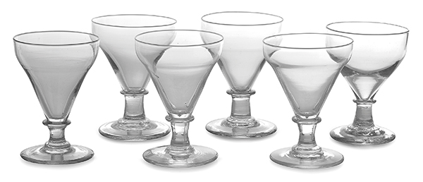 comprising six slightly different lead glass rummers with plain pan topped large bowl on capstan stem and conical plain or fluted foot, 13cm high