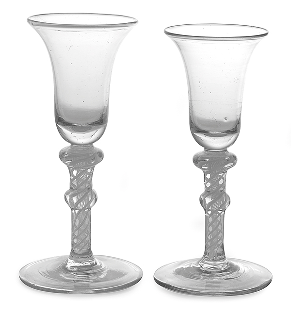 featuring plain bell shaped bowl on decorative spiral twist doubled knopped stem and conical foot, the tallest 16.5cm high