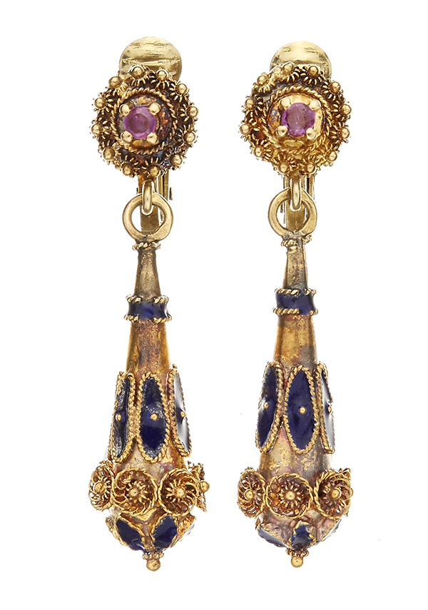 Each earring featuring a tapering drop set with dark blue enamel and gold cannetille work, to a conforming surmount set with a single pink sapphire, to clip fittings, in 18ct gold.