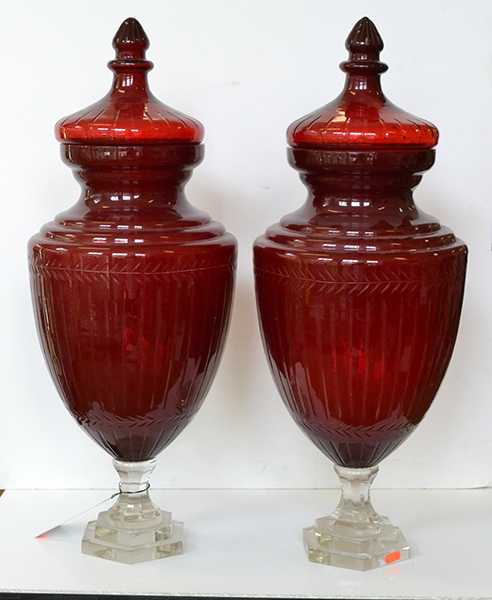 A PAIR OF REGENCY STYLE RUBY FLASHED AND CLEAR GLASS LIDDED URNS, 70CM HIGH