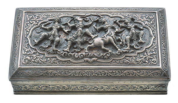 With embossed foliate decoration and Indian deity figures, 19 x 10 x 5cm
