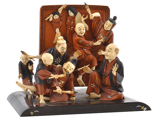 Ivory, stained wood and coral inlay, featuring a band of boisterous calligraphers bounding out of a calligraphy table stand, positioned on an ebony stand with red tablet signature, some losses, 27.5cm x 21cm x 22cm.