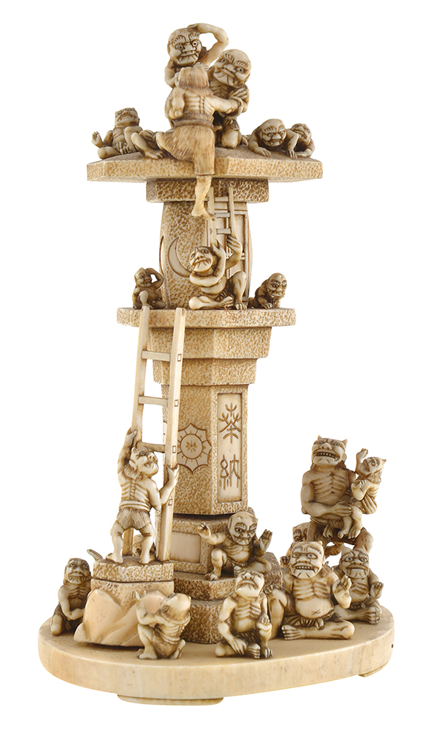 Featuring a troop of mischievous Oni (demons) climbing about a stone lantern, underside signed Gyokuhide 11 x 8 x 20cm.
